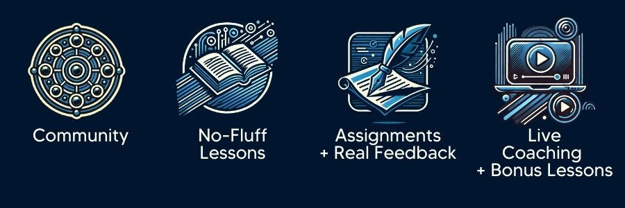 When the cohort kicks off at the beginning for May 2025, you get instant access to all the lessonsDan will teach the first 5 lessons live...at multiple times to fit multiple time zonesYou'll post your assignments into the communityGet feedback. Improve. Build Confidence.Use the LIVE sessions to workshop stories, get more feedback, and learn from others